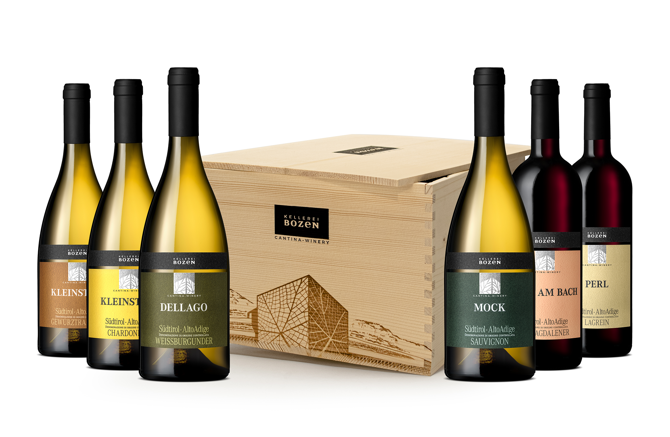 Een stijlvolle houten kist met een exclusieve selectie van 4 witte en 2 rode wijnen: onmiskenbaar weelderig en vrolijk, net als de lente.